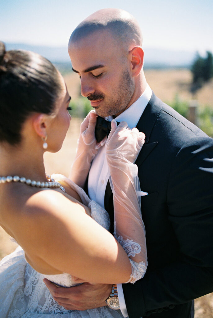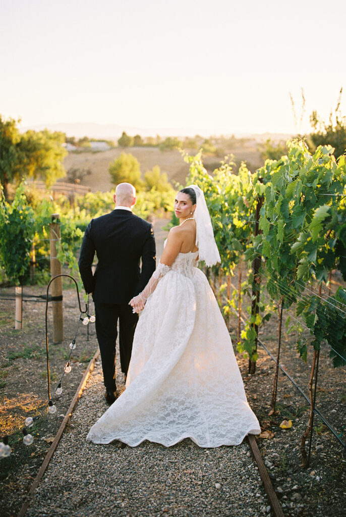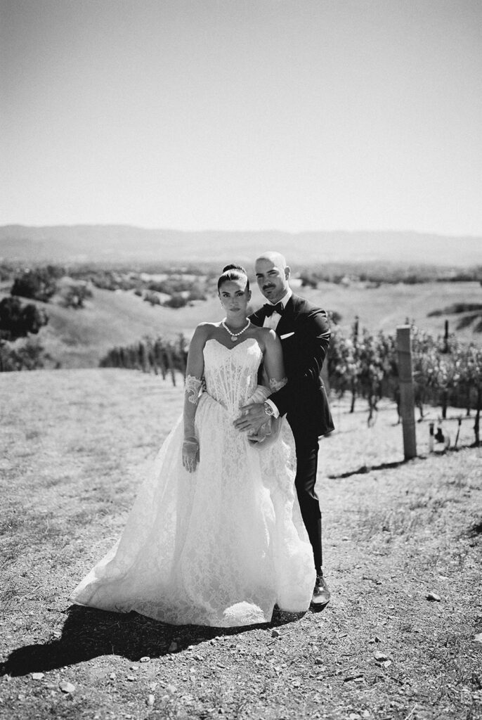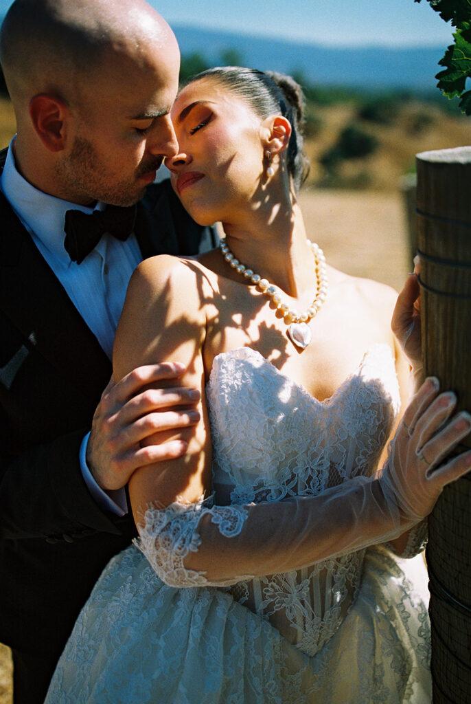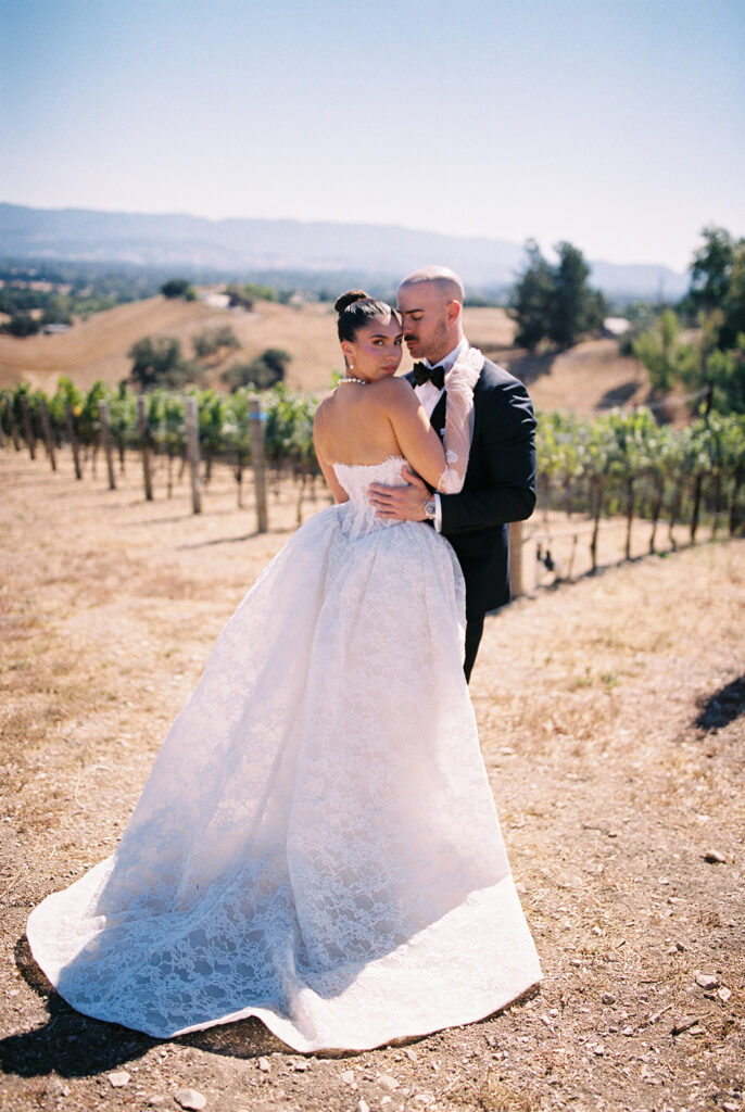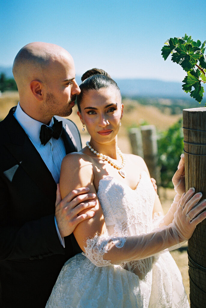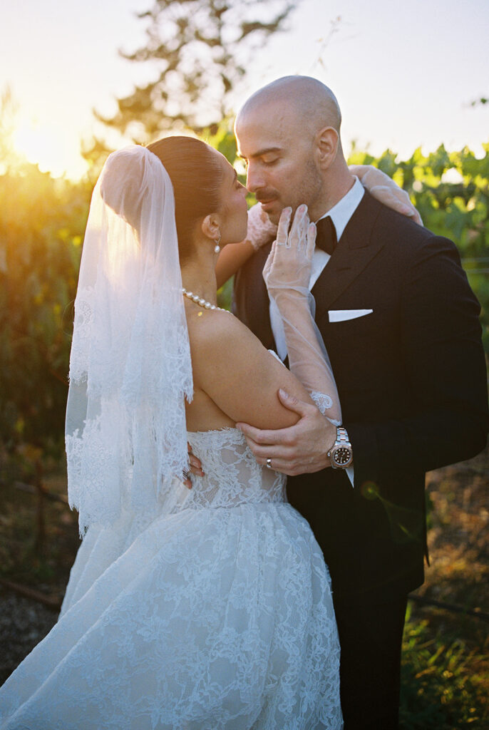 We captured Kaycee and Paul’s portraits among the sunlit vineyards on 35mm film. The natural light and subtle film grain gave each frame a timeless, cinematic feel, perfectly matching the romantic vibe of their day.