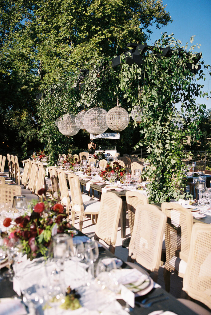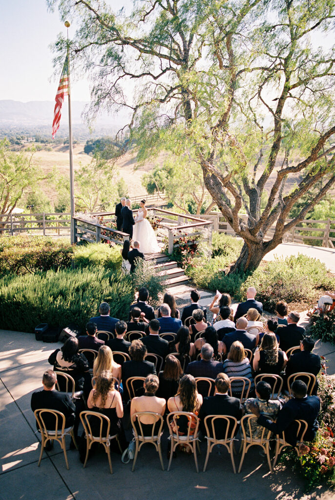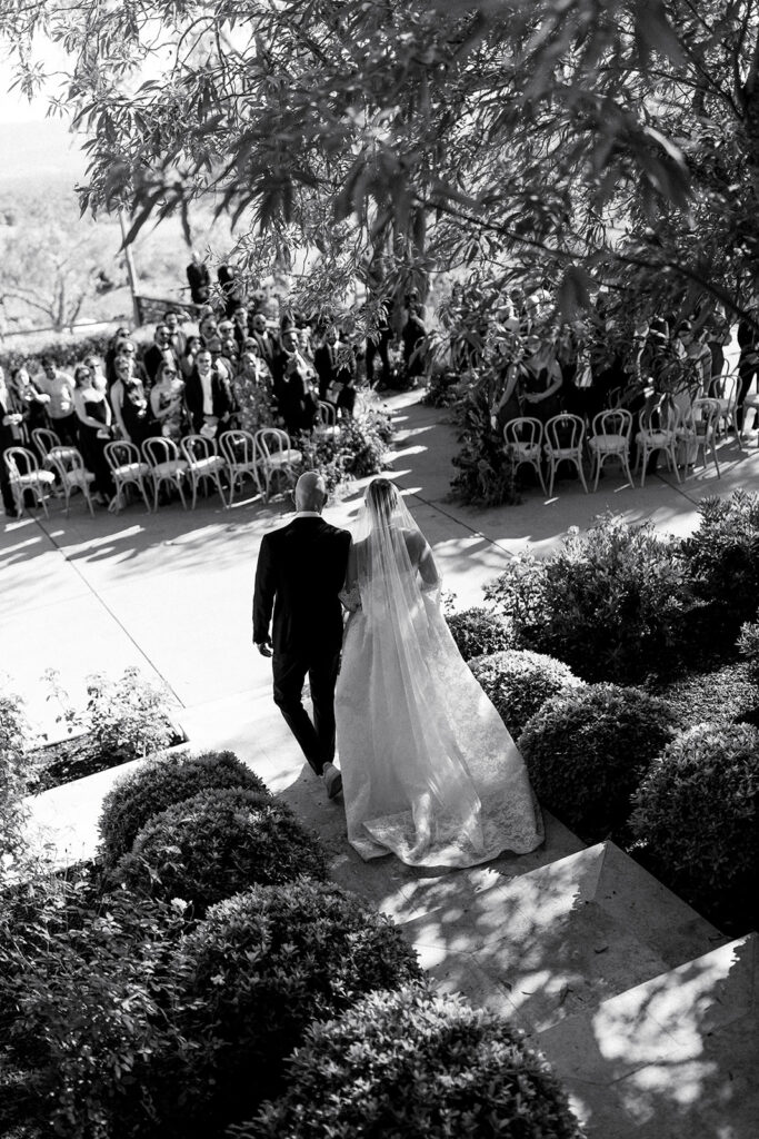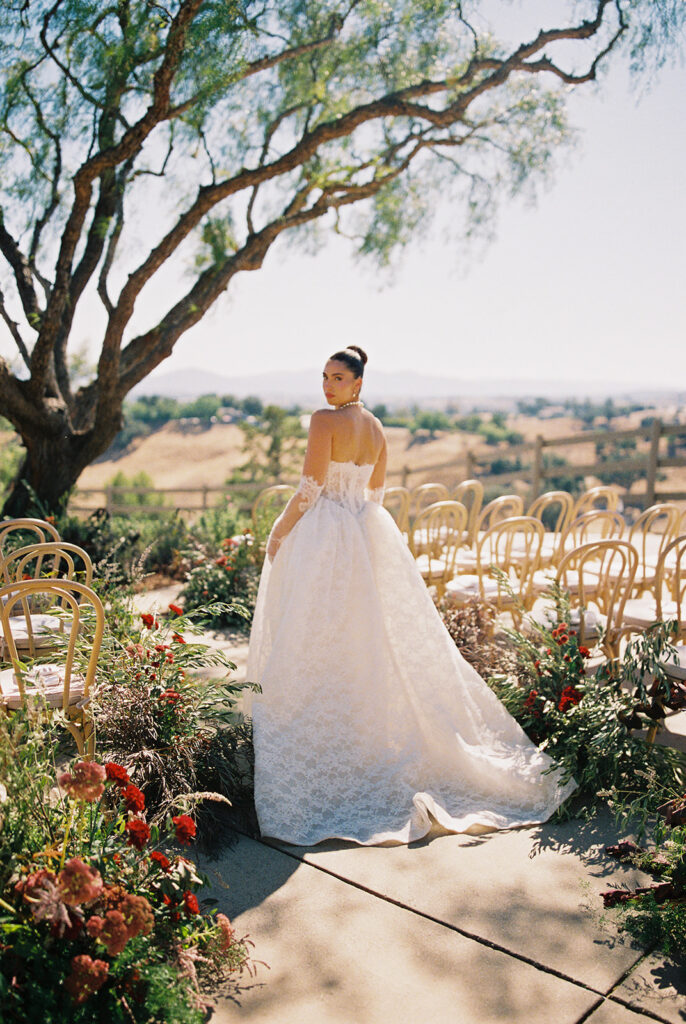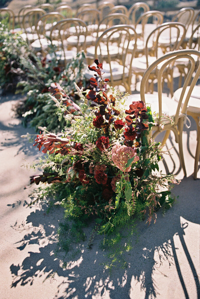 The ceremony took place in the front yard of Kaycee’s family home, overlooking the sweeping valley below. A serpentine aisle, lined with deep burgundy florals and delicate olive tree branches, led the way, creating an intimate yet dramatic setting. Surrounded by the natural beauty of the land and the warmth of family, every moment of their vows felt personal and unforgettable.