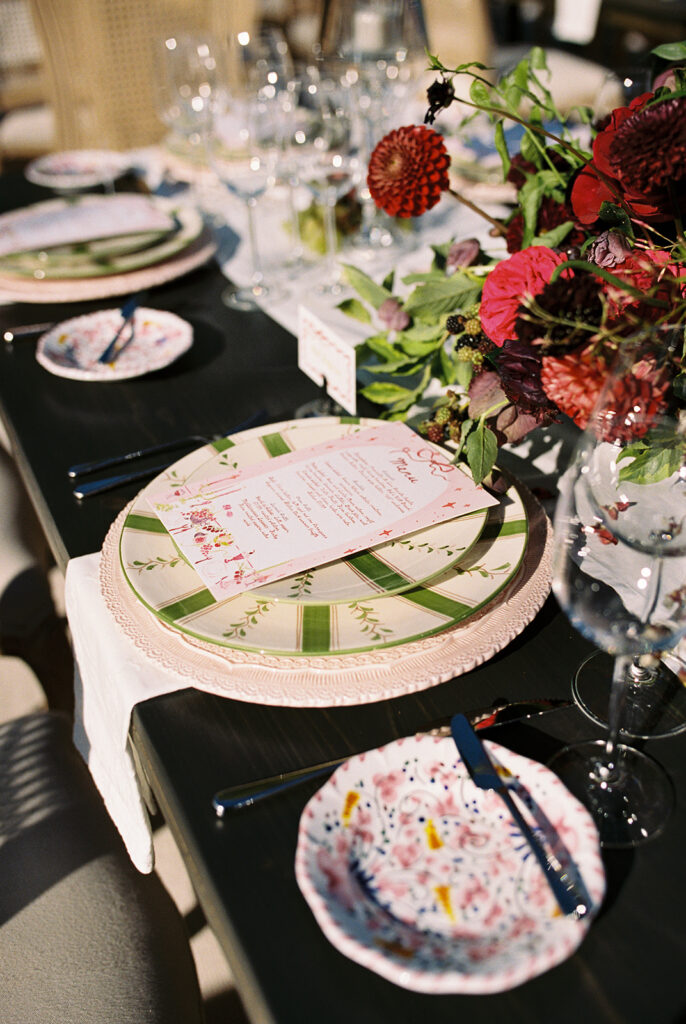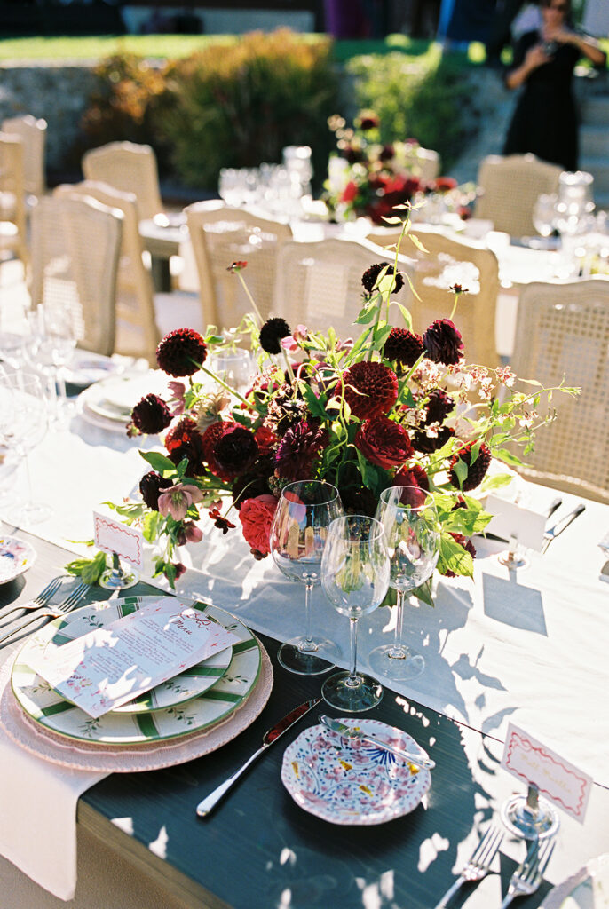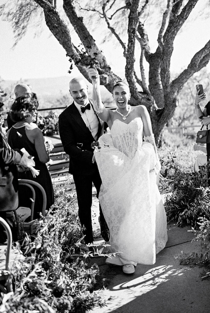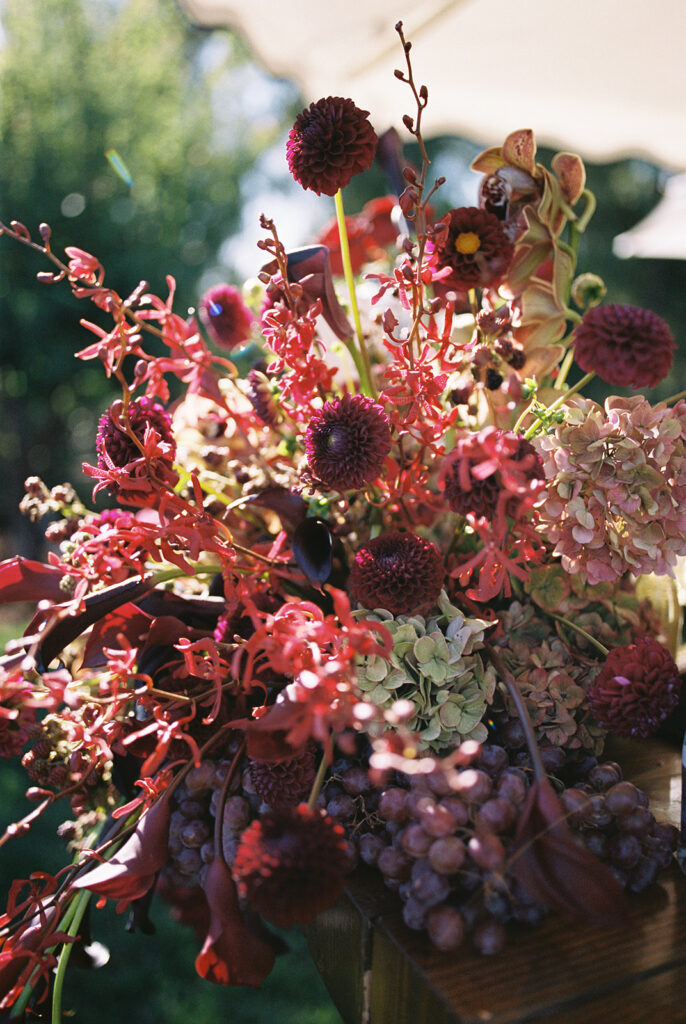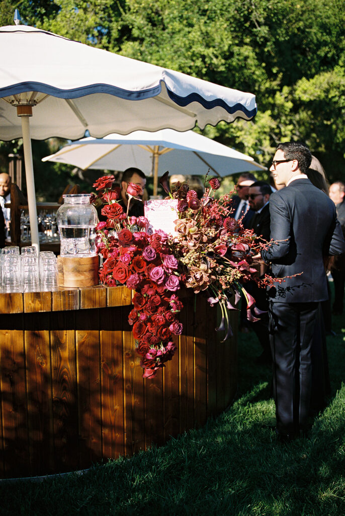 The ceremony took place in the front yard of Kaycee’s family home, overlooking the sweeping valley below. A serpentine aisle, lined with deep burgundy florals and delicate olive tree branches, led the way, creating an intimate yet dramatic setting. Surrounded by the natural beauty of the land and the warmth of family, every moment of their vows felt personal and unforgettable.