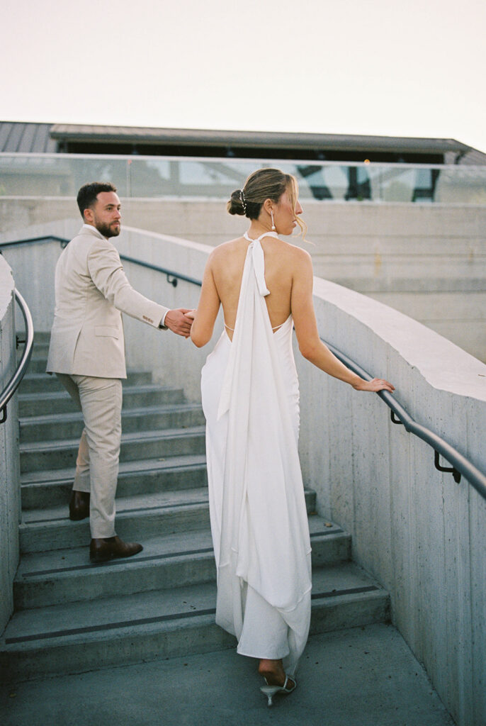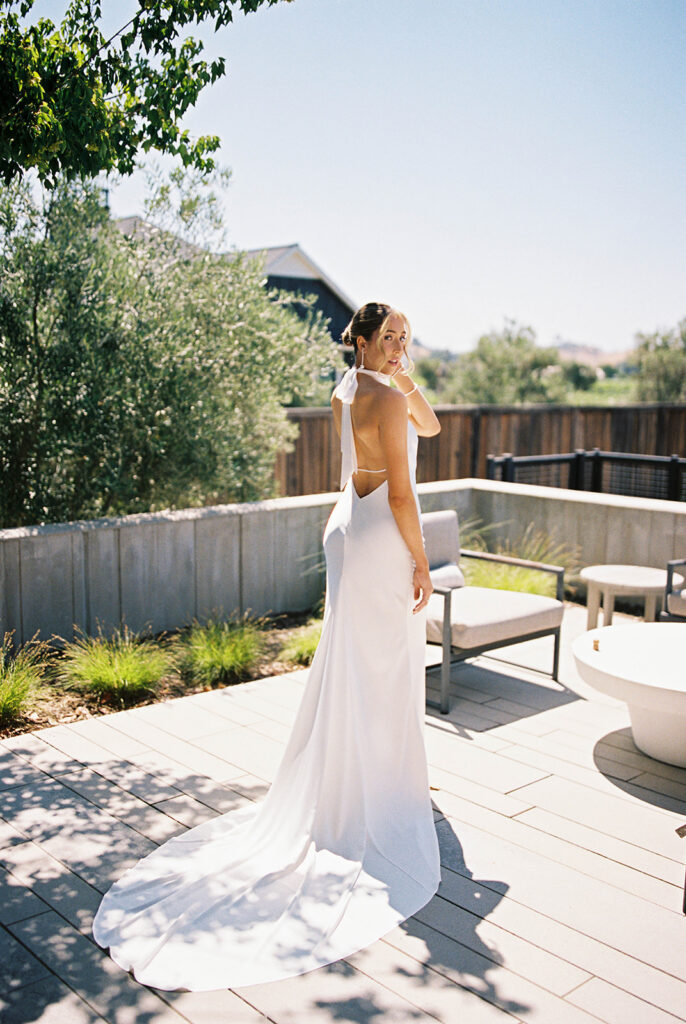 Olivia wore a satin halter gown by Grace Loves Lace, a silhouette that paired timeless simplicity with modern refinement. The fluid drape of the satin photographed beautifully on film, adding richness and softness to every frame. Her look perfectly reflected the overall mood of the day—elegant, unforced, and sophisticated.