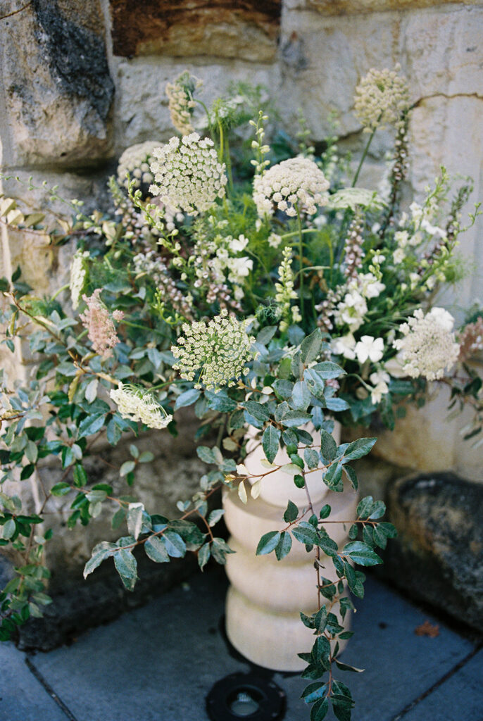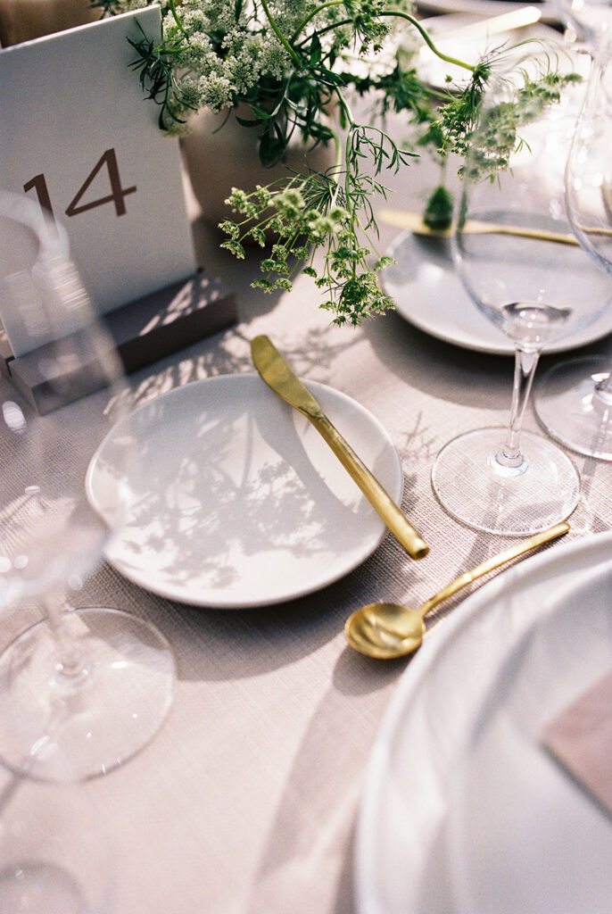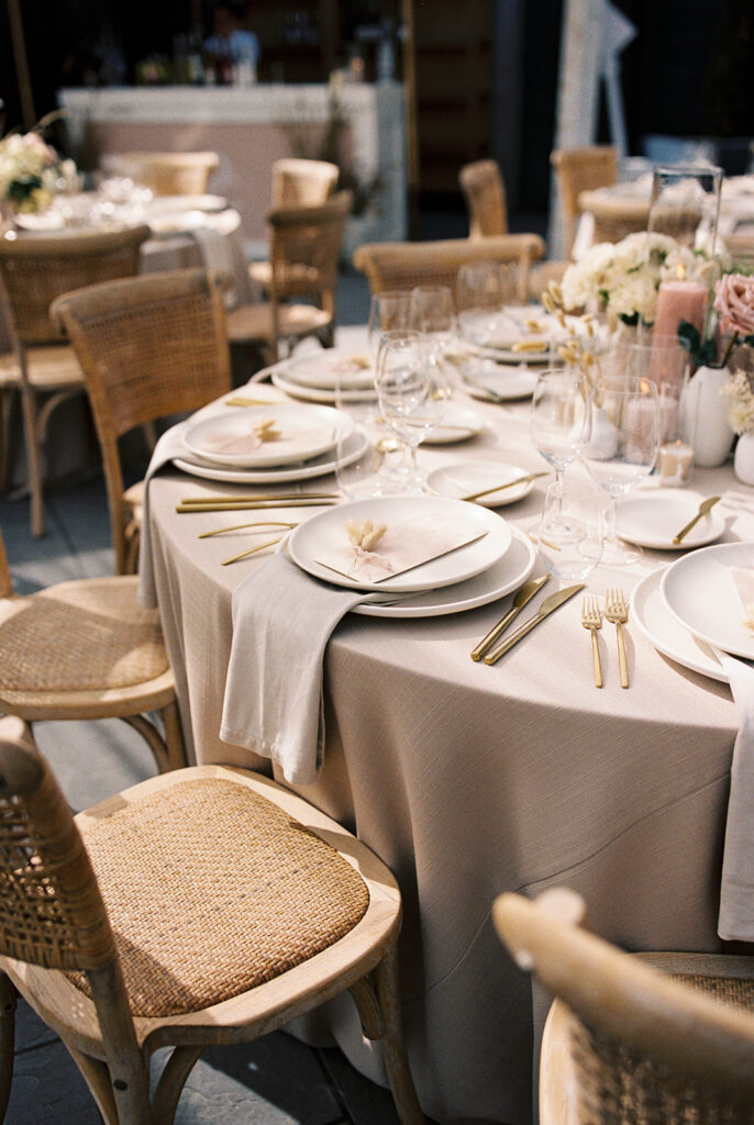 Soft neutrals, natural textures, and an organic-modern design language defined the aesthetic. Long wooden tables, sculptural chairs, airy linens, and textural florals in muted tones set a refined, understated tone that complemented the landscape rather than competing with it—all beautifully documented on film for that soft, romantic depth only analog can provide.