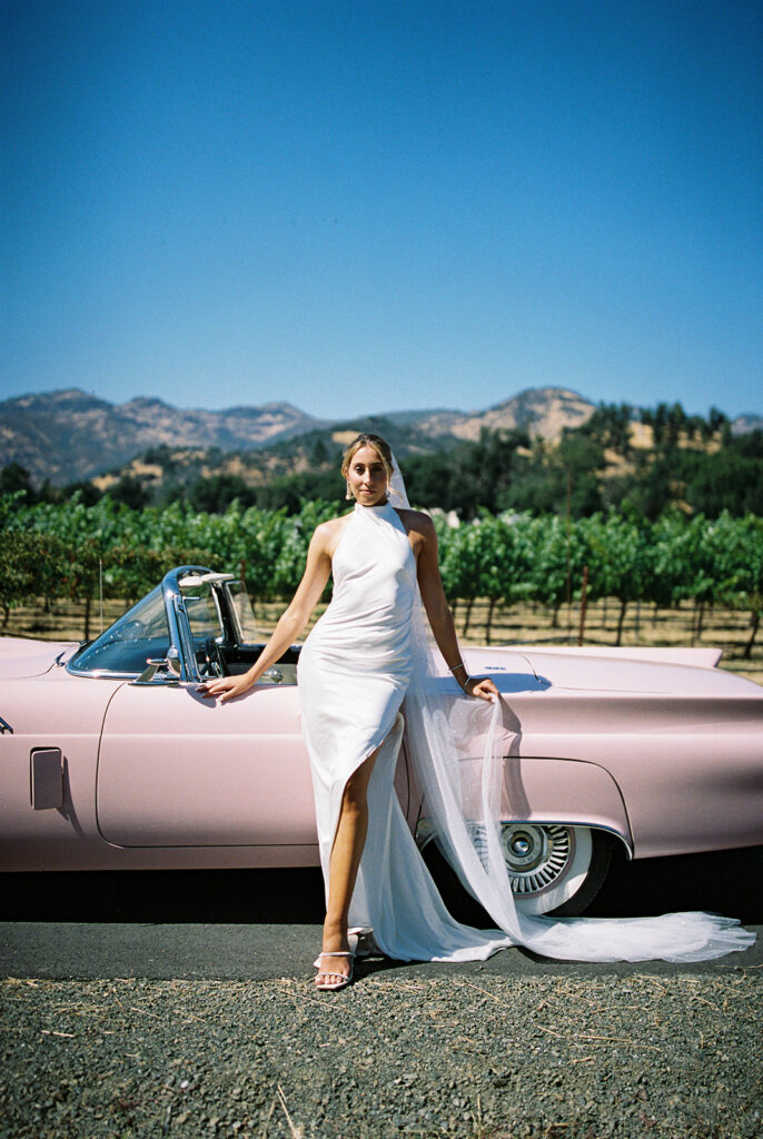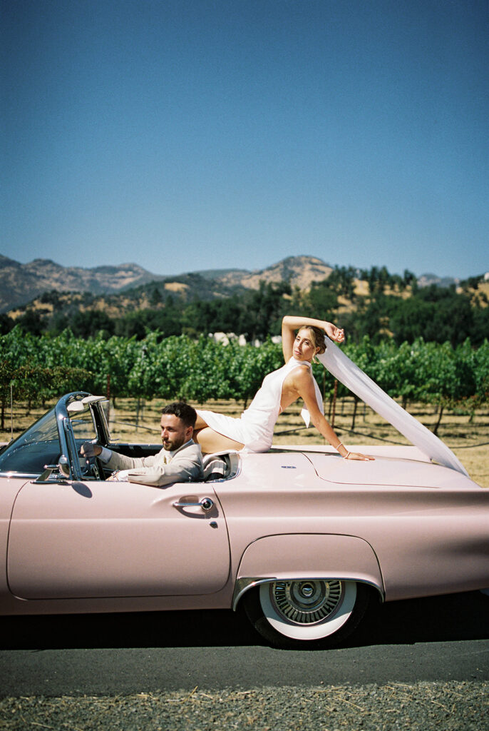 Olivia and Chris’s bride and groom portraits with their classic pink convertible were nothing short of iconic. Shot on 35mm film, the images have that nostalgic, sun-soaked quality that feels effortlessly cool and timeless all at once. Parked against the dreamy Napa backdrop, the car added the perfect pop of personality—playful, stylish, and completely them. The energy was fun, flirty, and a little bit bold as they laughed in the front seat, stole kisses over the door, and leaned into the just-married excitement of it all.